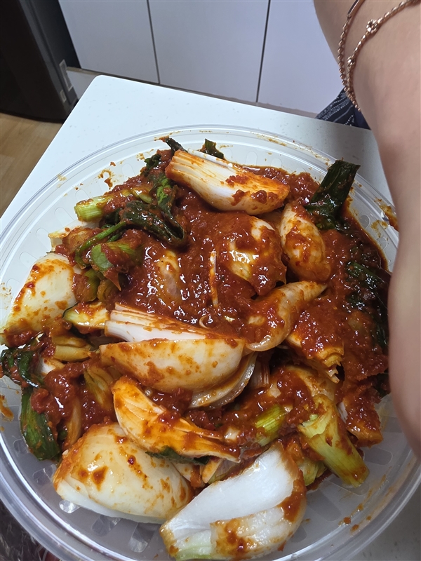 이건 첨 먹어본 김치인데 줄기는 파김치 맛이고 양파는 양파김치고 한번에 2개 맛을보는 경험 최고